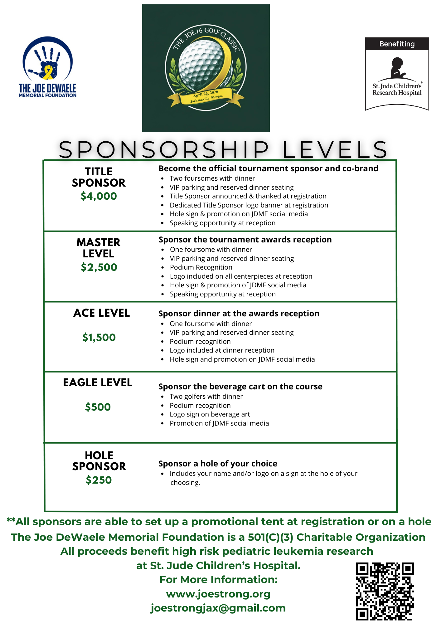 To secure your spot or to explore sponsorship opportunities, feel free to reach out to us at joestrongjax@gmail.com. Participating in this event directly contributes to our foundation's efforts in providing funding for high risk pediatric leukemia research at St. Jude Children’s Research Hospital and The Mullighan Lab.